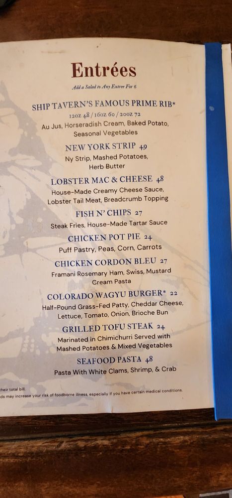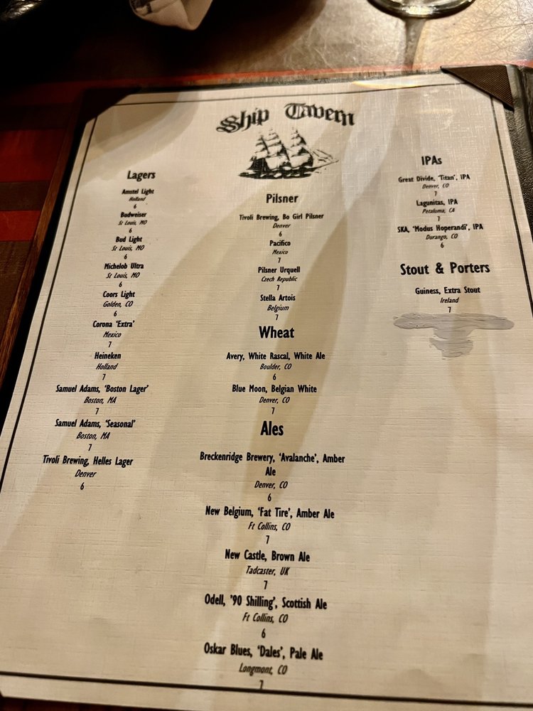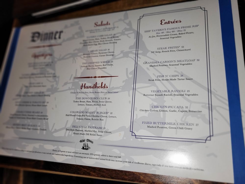 Ship Tavern, located in Denver, offers a cozy yet classy ambiance with a full bar and outdoor seating. Their menu features American cuisine, desserts, and a variety of drinks. Customers rave about their signature prime rib, juicy wagyu burger, fresh cod fish, and club sandwich with fries. The friendly and quick service adds to the overall dining experience, making it a great spot for both a quick bite and drinks with live music. With a historical nautical theme and attentive staff, Ship Tavern is a must-visit for those looking for a delicious meal and a pleasant dining atmosphere.